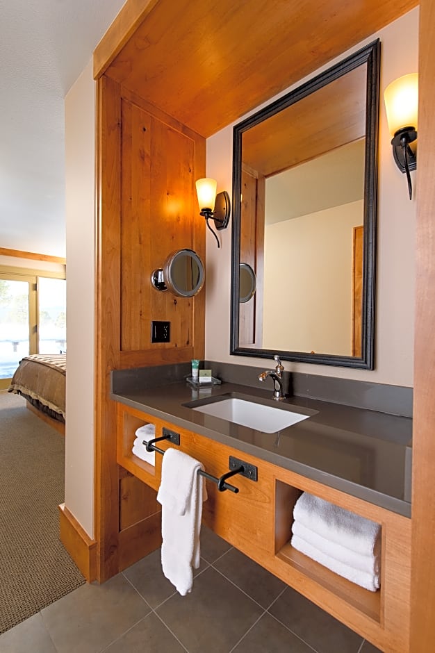 This lodge-style room with Northwestern décor features a river rock wall gas fireplace, a private deck, and a handicapped accessible bathroom with a roll-in shower. A cable flat-screen TV, small refrigerator, and coffee/tea maker are also included.